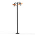 Lampadaire BELCOUR 2 têtes, E27, IP44, classe 1, diffuseurs verre dépoli. Matière réflecteurs : cuivre brossé vernis 084. Matière mât, bras : aluminium, teinte Noir velours 113