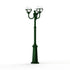 Lampadaire 3 têtes BOREAL, E27, IP44, IK08, classe 1, en aluminium globes Ø200 méthacrylate fumé. Teinte RAL 6009 Vert anglais 019. Garantie 25 ans anticorrosion sur l'aluminium