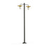 Lampadaire 2 têtes COOPER, E27, IP65, classe 2, diffuseurs verre soufflé opale. Matière Réflecteurs : laiton brossé vernis 075. Matière mât, bras : aluminium, teinte Noir velours 113